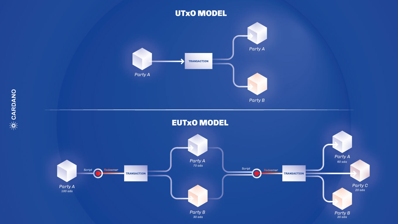 La “E” en las siglas EUTxO significa extendido, mejorando el UTxO de Bitcoin. Si bien los contratos inteligentes UTxO sólo interactúan con solicitudes inmediatas para confirmar una transacción, el modelo EUTxO de Cardano mejora esto.