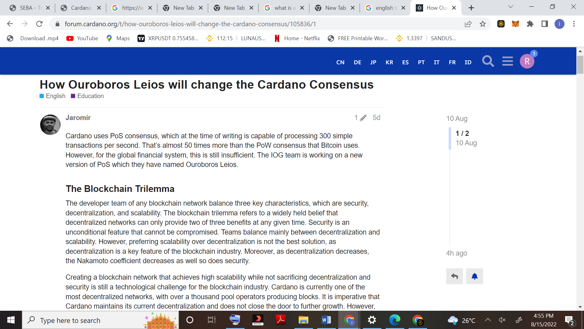 Cardano hutumia makubaliano ya PoS, ambayo wakati wa kuandika ina uwezo wa kushughulikia shughuli 300 kwa sekunde moja. Hiyo ni karibu mara 50 zaidi ya makubaliano ya PoW ambayo Bitcoin hutumia. Walakini, kwa mfumo wa kifedha wa kimataifa, hii bado haitoshi. Timu ya IOG inafanyia kazi toleo jipya la PoS ambalo wamelipa jina la Ouroboros Leios.