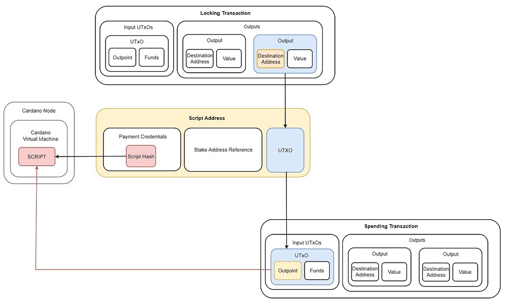 Na obrázku níže můžete vidět proces zamykání a odemykání UTxO pomocí skriptu. Uzamykací transakce má jeden výstup UTxO, jehož cílová adresa zobrazuje adresu skriptu. To uzamkne UTxO na adresu skriptu. Transakce útraty spotřebuje UTxO z adresy skriptu, což spustí spuštění skriptu na uzlu Cardano (červená šipka). Obrázek popisuje základní koncept. Níže si to vysvětlíme podrobněji.