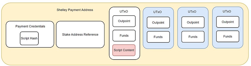 Na obrázku níže můžete vidět adresu Shelley obsahující platební pověření (payment credentials) včetně dvou možností, jak utratit asociovaná UTxO. Jedna adresa může být spojena s více UTxOs.