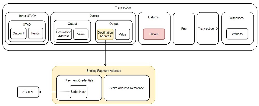 Adresa skriptu je odvozena z hash skriptu validátoru. Vývojáři vytvoří skript a vytvoří z něj hash. Hash se používá jako platební pověření adresy Shelley. Když se UTxO spojí s adresou skriptu, může být odemčeno pouze skriptem. Skript projde několika vstupy (o tom později) a pokud jeho provádění skončí s návratovou hodnotou True, prostředky mohou být utraceny.