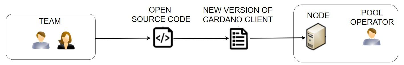 Команда IOG выпускает новые версии клиента Cardano и предлагает их операторам пулов. Один и тот же клиент связывается с людьми через кошелек Daedalus. Невозможно каким-либо образом навязать клиент. Команда IOG не знает операторов пулов и не располагает их адресами. Команда может только выпустить новую версию, опубликовать список обновлений и позволить людям ознакомиться с изменениями в исходном коде. Пользователи могут протестировать новую версию клиента в своей собственной или общедоступной сети и добровольно установить ее на свой компьютер.