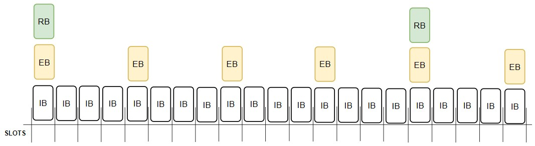 На изображении ниже вы можете увидеть возможную частоту создания всех типов блоков. Блоки входа (IB) создаются каждую секунду. Блоки подтверждения (EB) создаются раз в 5 секунд. Блоки ранжирования (RB) создаются раз в 20 секунд.